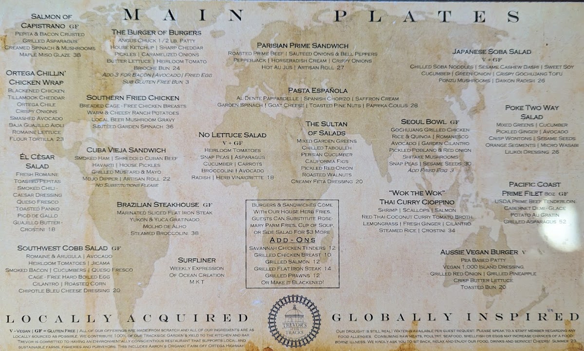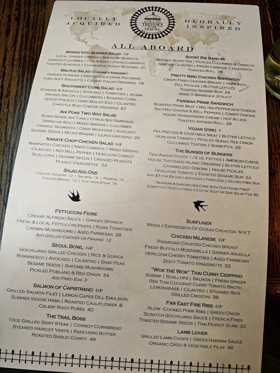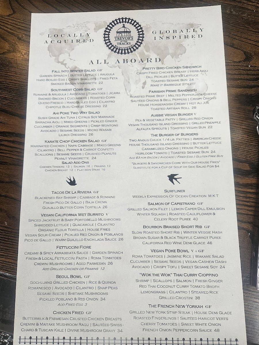 The food feels right at home within the warm, inviting setting by the train tracks, where the vibrant energy of passing trains and evening performances creates a backdrop for good company and casual conversation. Whether you’re enjoying the hearty Mac N Cheese or something a bit more adventurous like the Russian Reuben Sandwich, the menu mirrors the comfortable, approachable vibe that makes visiting Trevor’s a welcoming experience all day long.